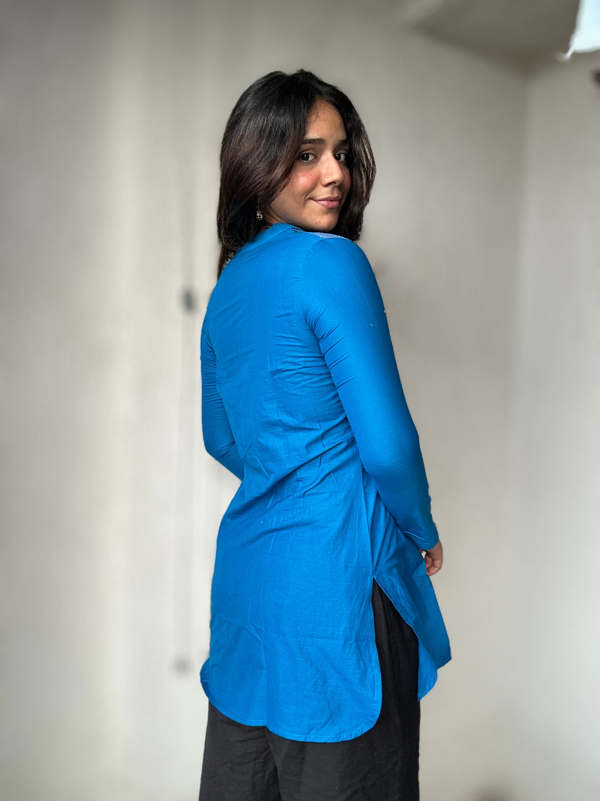 Pure cotton full sleeves tunic with silk thread embroidery on front panel. Front open style.